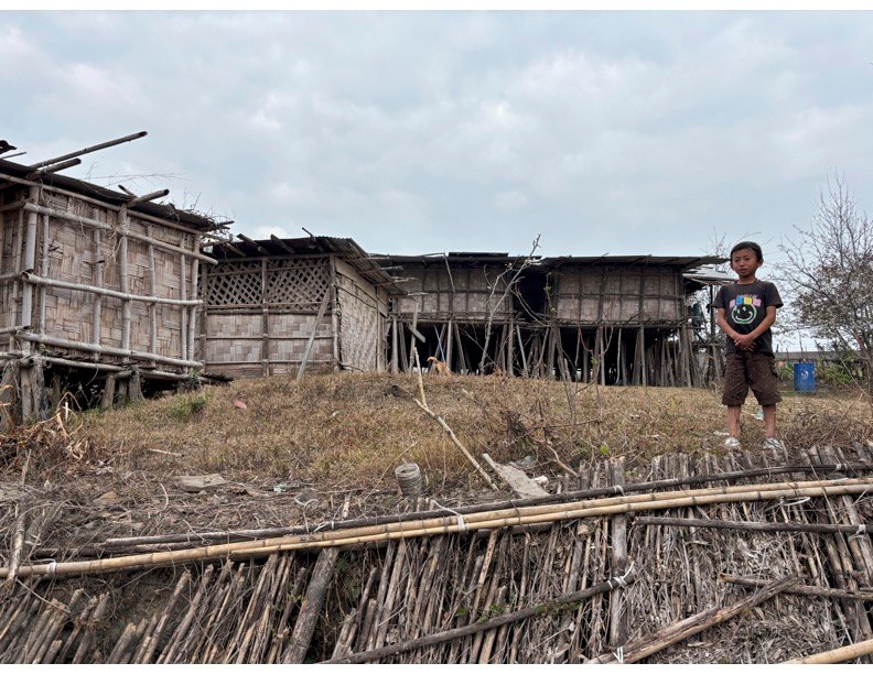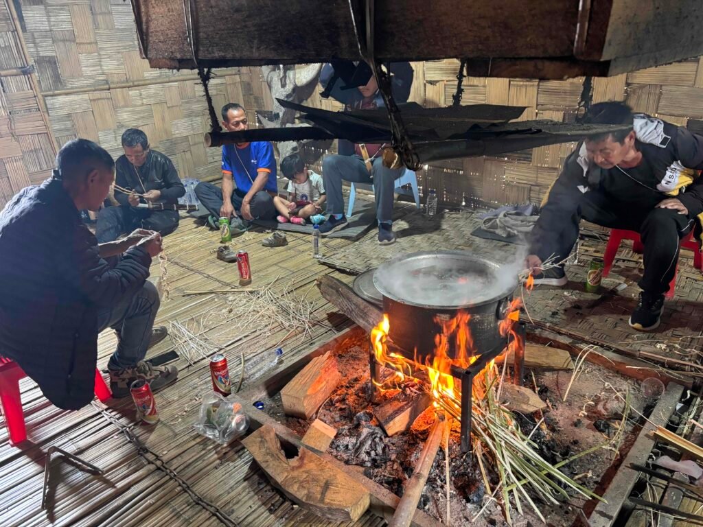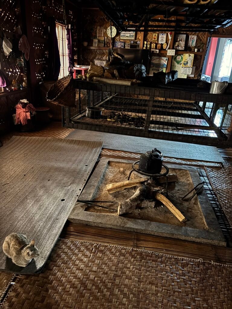 The traditional Nyishi communal house had bedrooms around a central fire pit where everyone gathers for dinner. However, tucked in one room one the side is a very modern beautiful kitchen and their living room boosts a large screen and comfortable couches. It is raised off the ground to protect against floods and the flooring and the ceiling is made of bamboo, allowing smoke to drift upward and out. Our walk takes us past a number of the Nyishi houses, some almost entirely of bamboo, while nearby are modern concrete houses. There is such a sharp difference between the two types of housing styles that I wonder whether envy causes friction among neighbors.