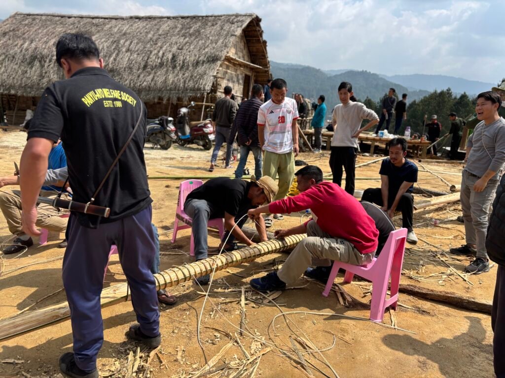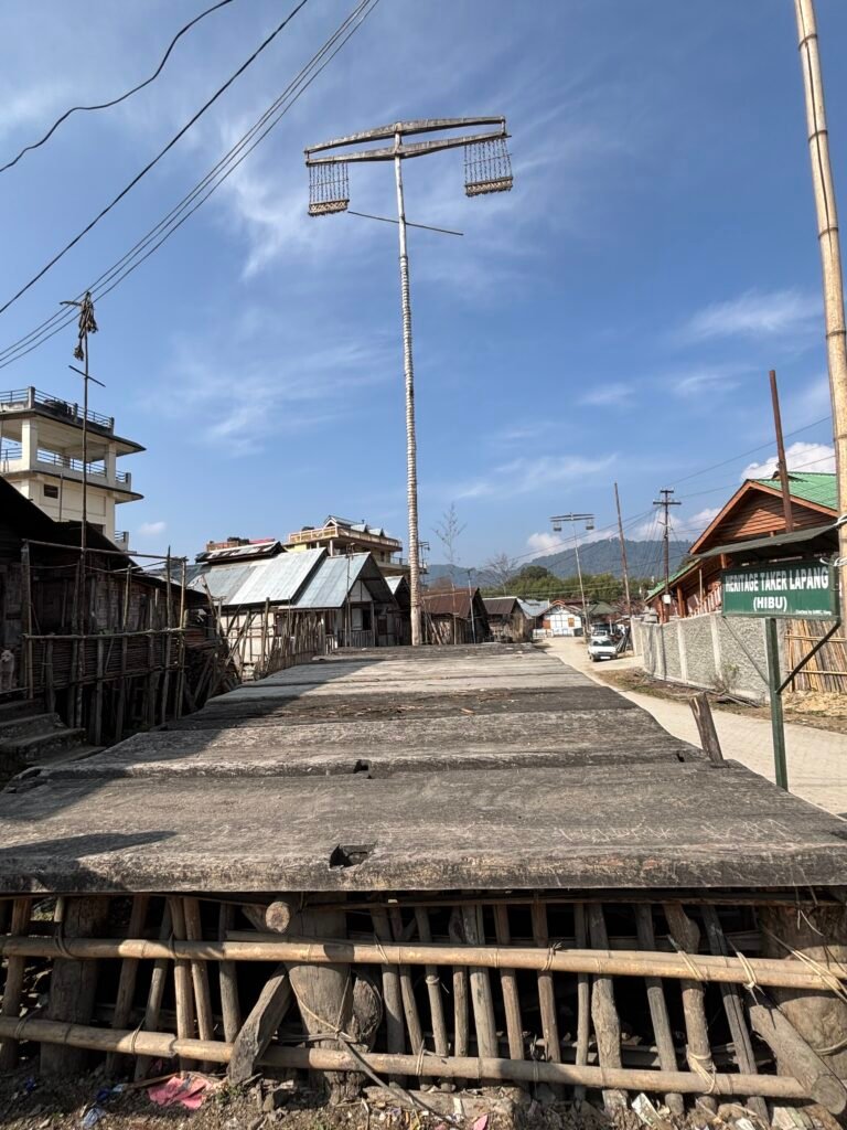 The next day we spend visiting Apatani villages, with a local guide who is from the Hong village and knows everyone. Today is special in a number of ways: for the Hindus it is Holi, the spring time celebration of color and music associates with Lord Krishna. But our exposure to that festival is limited to the loud music we hear blasting around our hotel from a local party and the sight in the city market of men with clothes stained with colored powder emblematic of the holiday. The Apatanis believe in a religion based on the sun and moon. We are privileged to see a unique Apatani event today, the raising of the Babo, or tall pole with traditional form and symbols which only happens for each clan in the village once a year. Each of the Apatani clans raises its own Babo which is placed near a dais built of teakwood called a Lapang on which the men will sit and gather through the year to discuss whatever issues arise to be resolved among them. Signs in English state that women are not allowed to sit on the Lapang. The pole itself represents womankind in some form. Smaller forms of this pole are raised at each house upon the birth of a son.
