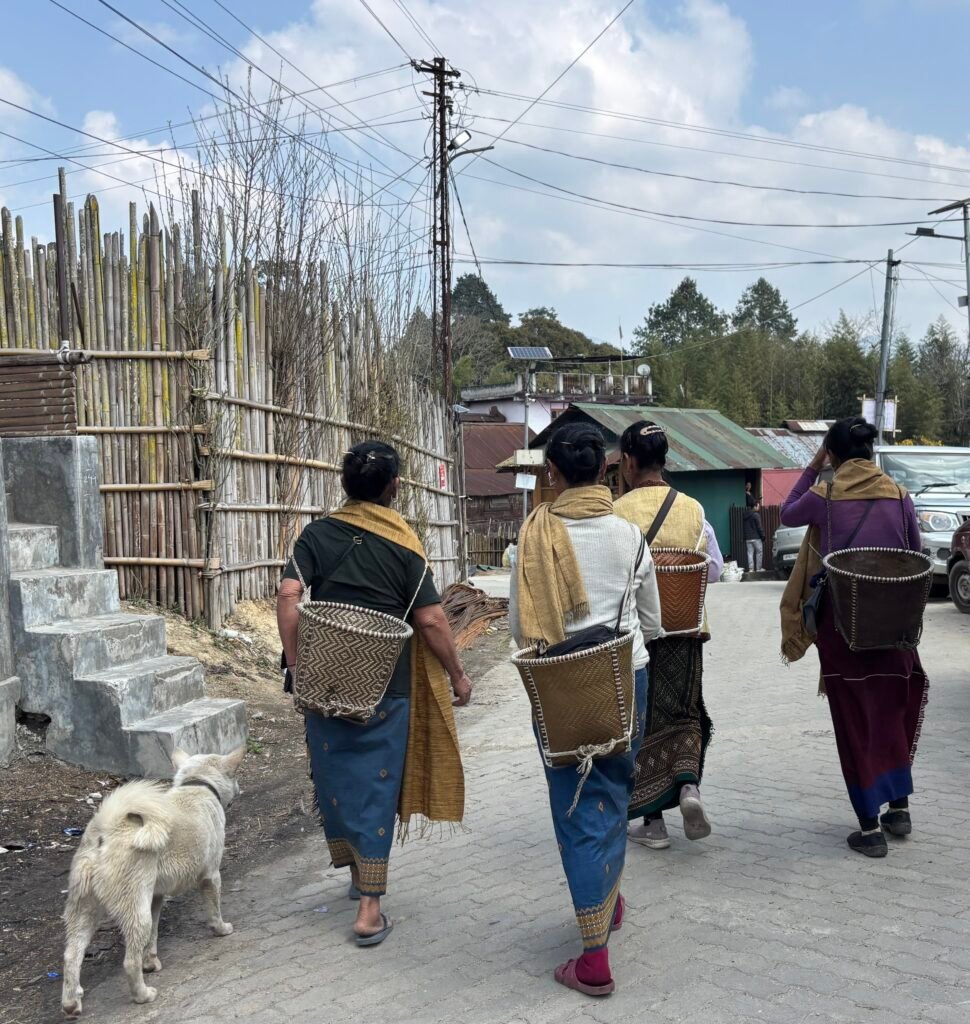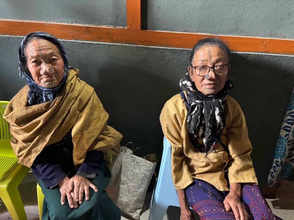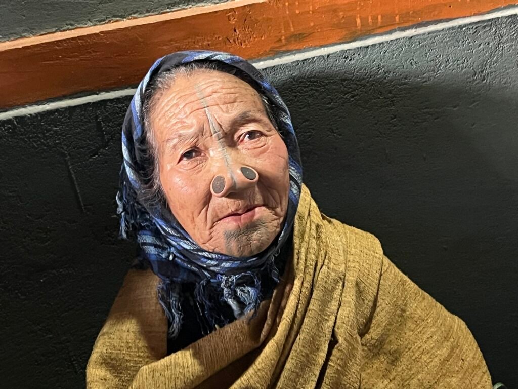 I have seen an unusually large number of dogs and cats in the Apatani villages, most of whom have collars on them and seem healthy and well-cared for. The old Apatani women themselves are known for having facial tattoos and nose plugs, which began, we are told, so that the neighboring tribes would not steal their beautiful women. This tradition was discontinued in the 1970’s, I believe, but can still be seen on many of the older women we saw in the village and at the wedding party.