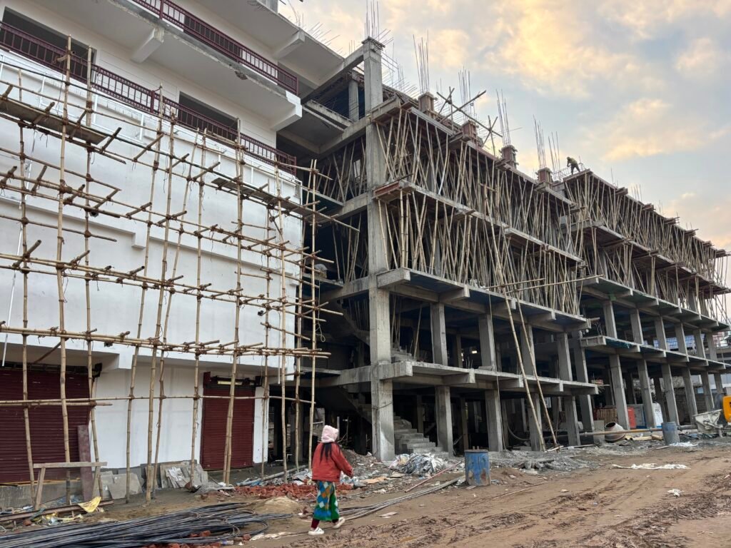 .Our arrival by plane into Assam at Guwahati was a surprise to us as we expected a quiet rural environment but found a large spread out and bustling metropolis with all the commercial displays and motifs of modern India, large brightly lit stores and many-storied buildings under construction. Throughout our travels here, on every street, there are numerous partially complete reinforced concrete multi-leveled post and slab construction sites on which we invariably see the top floor still supported by a multitude of bamboo shoring props. Bamboo continues as the main scaffolding material here. Bill says there will be infill brick to rigidify the non-stable rectilinear geometry of the structures – important in a location which is very earthquake prone – and then a final layer of plaster. Large parts of Assam were destroyed in an earthquake in 1897 and then again in 1950 so earth movement is a serious consideration for any construction.